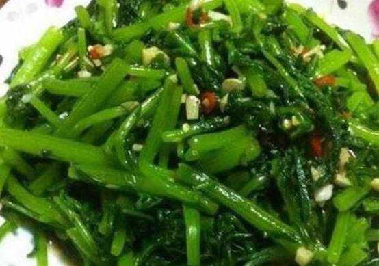 食材:茼蒿300g、鹽2g、蒸魚豉油5ml、蔥絲2g、蒜末2g、紅辣椒2個、熱油5g
