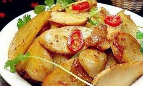 3、先放入土豆片翻炒一會,再放入杏鮑菇翻炒一會。