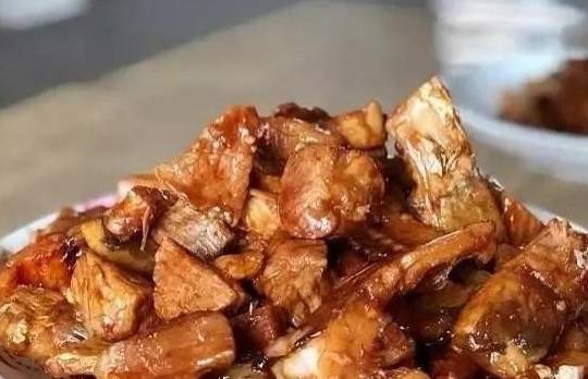 1.用清水泡去咸青魚的咸味,再切2厘米見方的塊。把治凈的豬五花肉也切成同樣大小的塊,汆一水待用。另把冰糖炒成焦糖色。