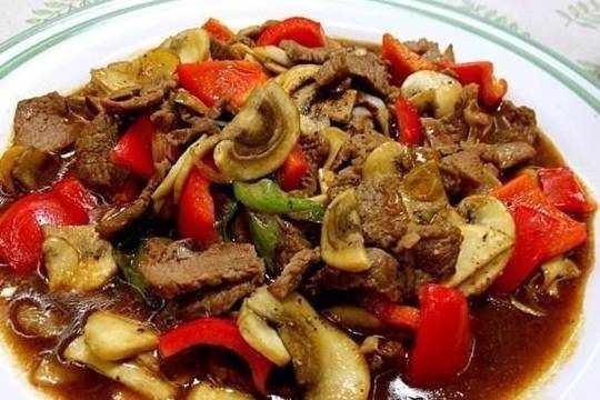 6.牛肉入鍋,大火炒至開始變色(別完全變色哈);立馬放蘑菇(蘑菇炒出的水別倒進去);接著立馬放加瞭生粉後的調料汁;拌炒兩下;馬上放紅椒;大火翻炒至湯汁稠立馬關火;喜歡的話就擱點兒黑胡椒粉出鍋;