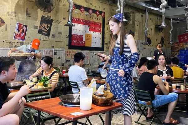 於是美女老板娘想出瞭一個好點子,將地攤搬進餐飲店裡,把餐飲店做成地攤的形式,采用地攤的吃法,門店裝修,桌椅凳子,菜品價格全部地攤化。