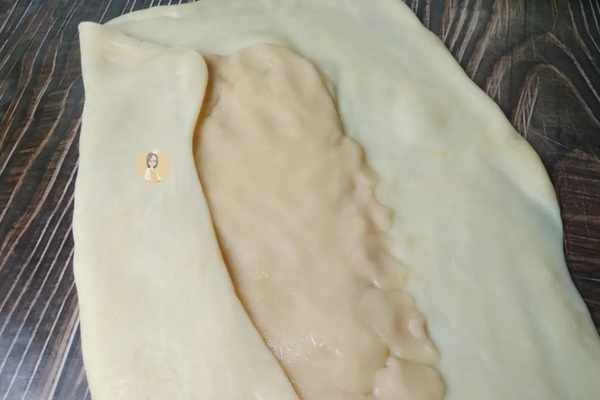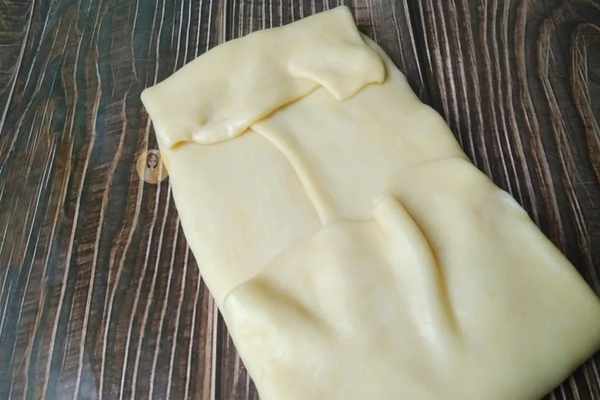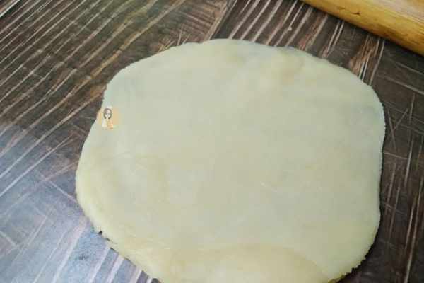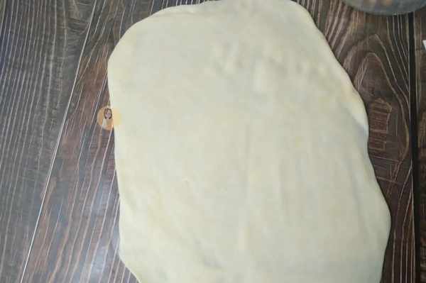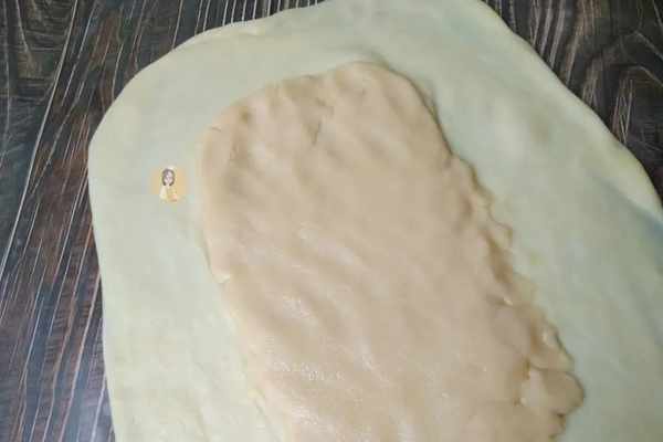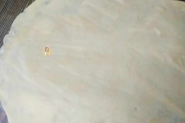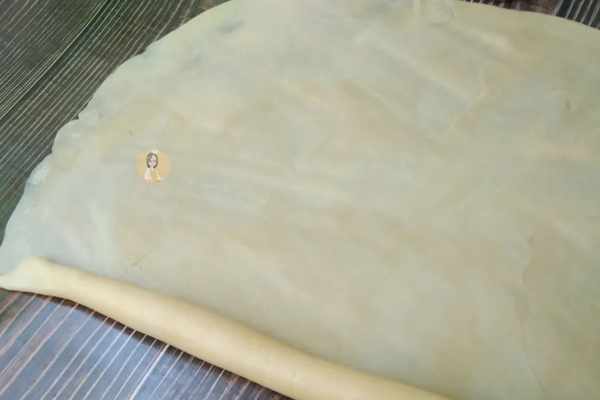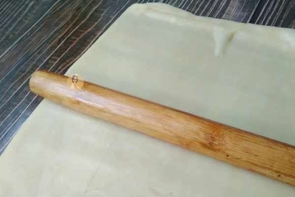 將醒好的水油皮取出擀成長方形,盡可能的擀薄一些。