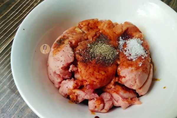 肉糜中加醬油、生抽、鹽、糖、胡椒粉拌勻,醃制30分鐘。