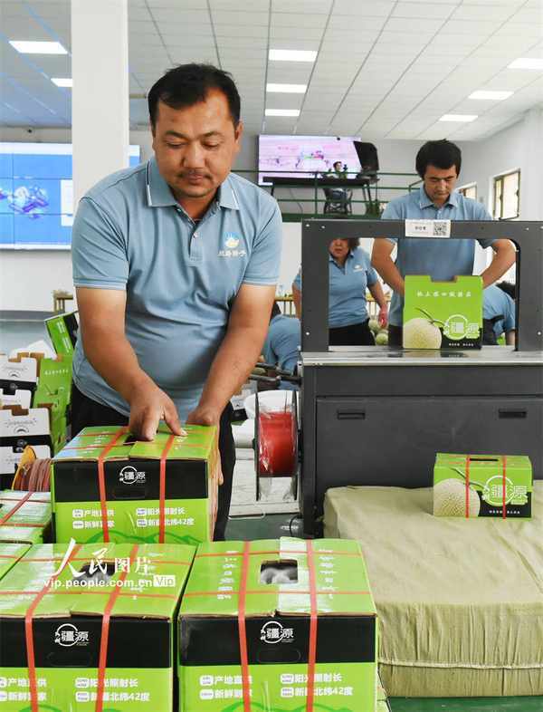 員工在新疆吐魯番市紅石榴電商直播孵化基地包裝哈密瓜。