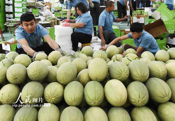近日,吐魯番大棚哈密瓜陸續成熟上市,新疆吐魯番市紅石榴電商直播孵化基地通過網絡平臺推介銷售,讓吐魯番名優農產品走向全國,助力鄉村振興。圖為員工在新疆吐魯番市紅石榴電商直播孵化基地分選哈密瓜。 劉健攝(人民圖片網)