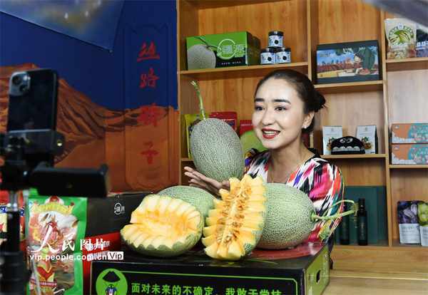 網絡主播在新疆吐魯番市紅石榴電商直播孵化基地推介哈密瓜。