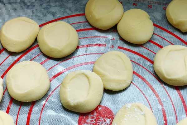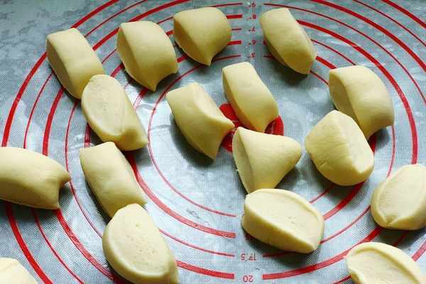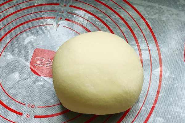 4、醒發好瞭的面團取出來,再用手揉一下,整理成光滑的面團,再將面團搓成長條狀,分成小劑子,在手上蘸取少量的面粉,把小面團一個個的壓扁。