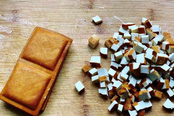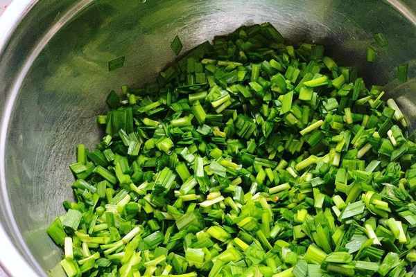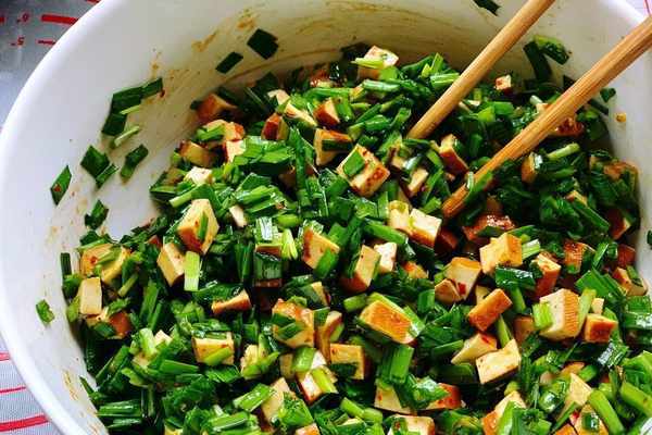 2、趁著醒面的時候我們再來準備餡料。韭菜清洗幹凈瞭以後把水分立幹,切成末放進稍微大一點的盆裡面。豆幹也是一樣,切成小塊的放進盆裡面。