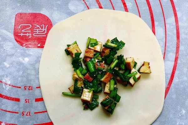 【食材清單】:中筋面粉,開水,豆幹,韭菜,鹽,蠔油,十三香,花生油,蠔油。