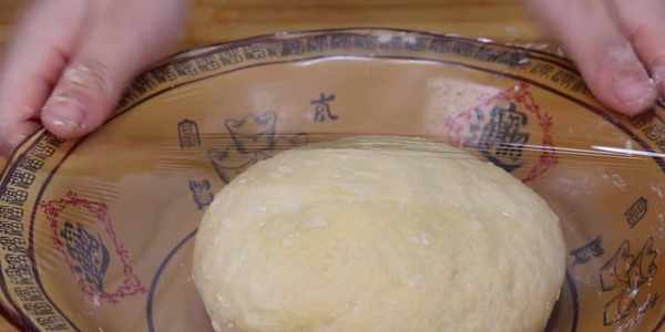 2、在揉好面團之後,我們這一步就要開始餳面瞭。為放著面團的盆裹上一層保鮮膜,靜置在陰涼處餳發。在將面團餳發至原來的兩倍大時,即可去掉保鮮膜將面團放在一旁備用瞭。
