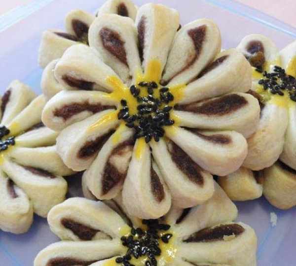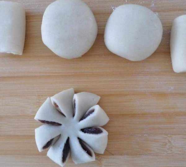 第12步、我再包上豆沙,然後搟成餅,用剪刀剪出花瓣,剪出12個口子,並將每一片扭轉45度,使豆沙餡露出朝上。剪成12個花瓣是最好看的,但是我就是個數字盲啊,哈哈,算錯瞭,拍照時居然剪成瞭八個花瓣的,我對自己真是沒脾氣啊!!等會成品上12個花瓣的,哈哈