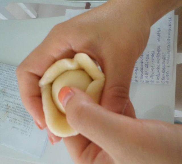 第5步、左手按住中間的面團旋轉,右手的虎口處收,把它包好