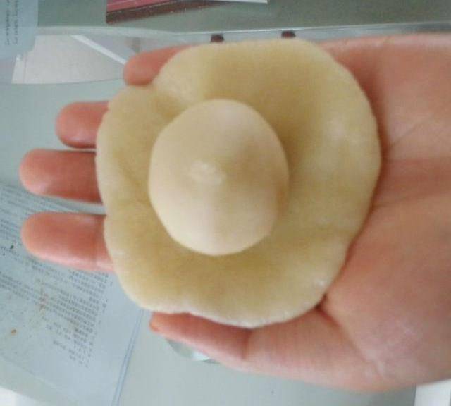 第3步、接著把酥皮小面團包入水油皮面團中,先將水油皮面團壓扁