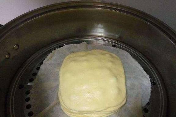 8.把面片稍微壓一下,然後放入墊有屜佈的蒸鍋內,鍋裡放熱水,蓋上蓋子,靜置大約15到20分鐘左右。然後,開大火直接蒸20分鐘,關火,3分鐘以後開蓋。
