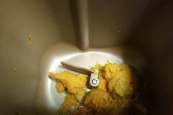 2.南瓜泥中加入面粉和酵母,揉成一個均勻的面團,蓋上保鮮膜,靜置15分鐘左右。我用瞭面包機的“和面”程序十分鐘。南瓜的含水量不同,如果你覺得太幹,可以稍微加一點點水,自己要看下面團的狀態。但是,千萬不要急著加水,因為南瓜和面是越揉越濕的。