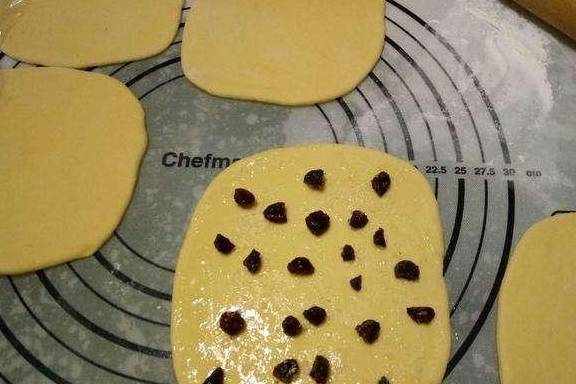 6.面片上刷油,撒少許白糖,放上幾顆蔓越莓幹碎。