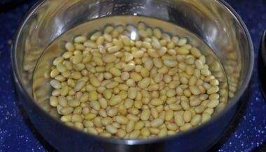 大伯每天早上起來,他便將黃豆磨成豆瓣兒,去皮後放入水中浸泡,晌午時分便將豆瓣兒撈出,倒入石磨中磨成細漿,接著用佈過濾,過濾後的細漿直接倒入鐵鍋裡,用旺火燒開,然後迅速倒入調好內酯的瓦缸裡,大約5分鐘後,晶瑩晃動的豆腐腦便成型瞭。