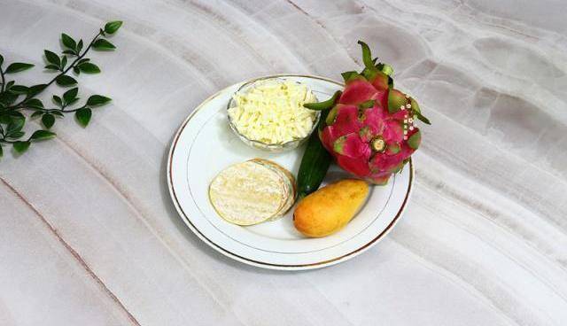 把所用到的食材準備好,食材及分量供參考,實際分量可以適當增減。食材:果蔬餃子皮6張、白色火龍果果肉20克、水果青瓜10克、芒果肉15克、馬蘇裡拉芝士80克。