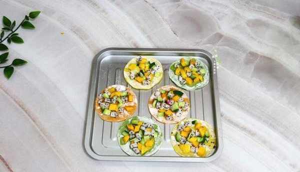 預熱烤箱,200度;把準備好的餃子皮放在烤盤裡,然後把切好的水果青瓜丁、火龍果肉丁、芒果肉取適量放在餃子皮上面,最後再撒上適量的馬蘇裡拉芝士。