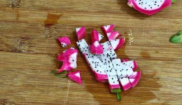 接著處理白色火龍果,我是直接把火龍果帶皮切開切小塊,最後再去皮,也可以先去皮再把果肉切細。