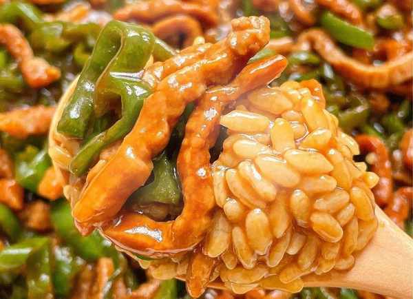傢常菜少油少鹽炒就是減脂餐呀,煎過的肉絲焦香入味,裹滿瞭湯汁,米飯拌著醬汁,這吃法真的絕,一定要試試。
