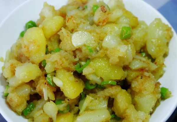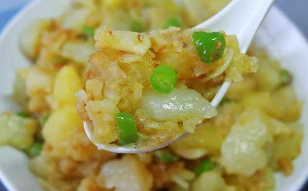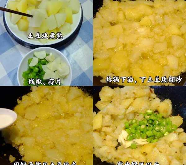 3、用鏟子將土豆按壓成半土豆泥狀(全部按成泥狀就不好吃瞭),煎至起鍋巴(根據個人喜歡來決定鍋巴程度)