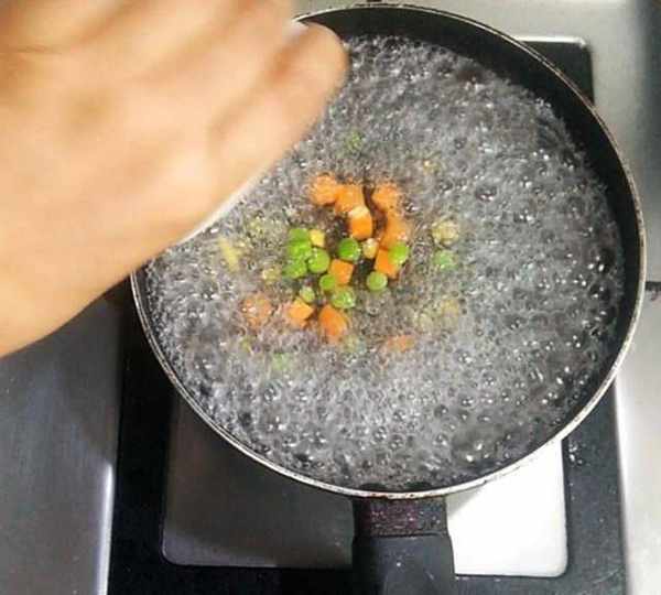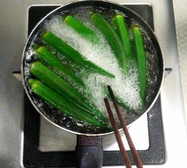 第6步、秋葵用鹽水浸泡10分鐘洗凈,燒一鍋開水,水中加少許鹽護色,下秋葵煮沸再煮1~2分鐘,不要把秋葵煮軟。撈出用冷水過涼。
