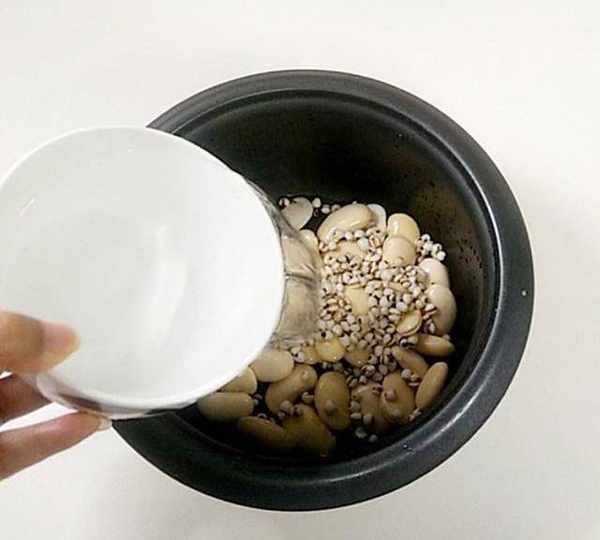第5步、白蕓豆和薏米放入電飯鍋,加足夠的水煮約1小時,煮到豆子綿軟出沙。