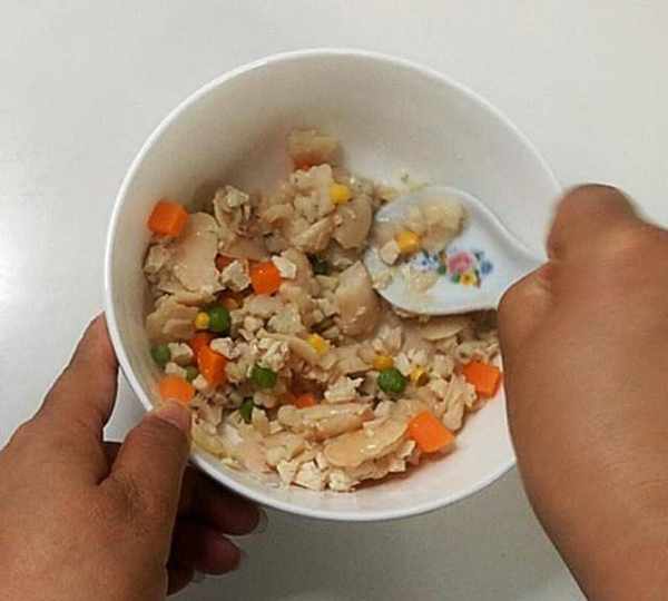 第8步、蕓豆和薏米放碗中,加入雜菜和熟雞肉丁,用勺子壓碎豆子。