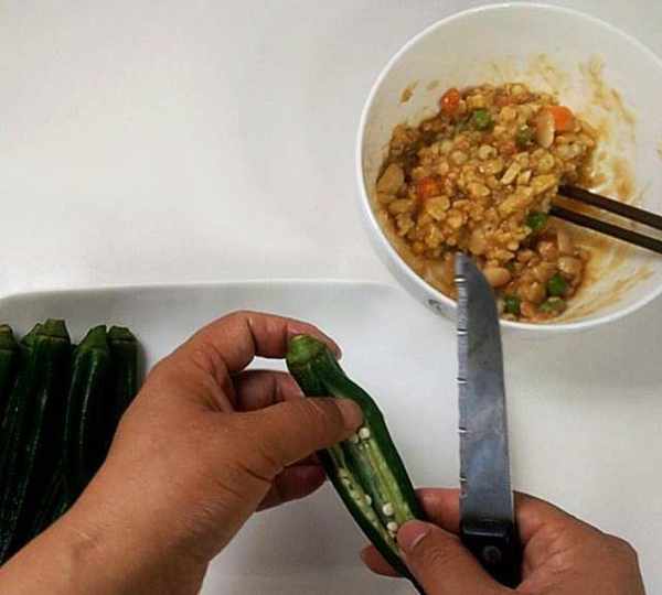 第10步、用刀劃開秋葵一邊的皮,註意不要劃穿另一面。