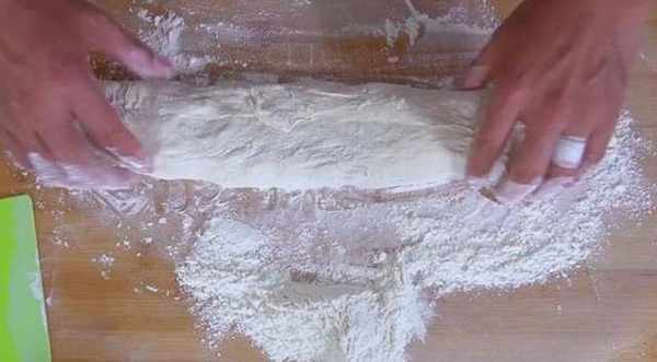 5.案板上撒上多一點的幹面粉,將面糊倒入幹面粉中表面塗抹均勻,再順勢整理成條。