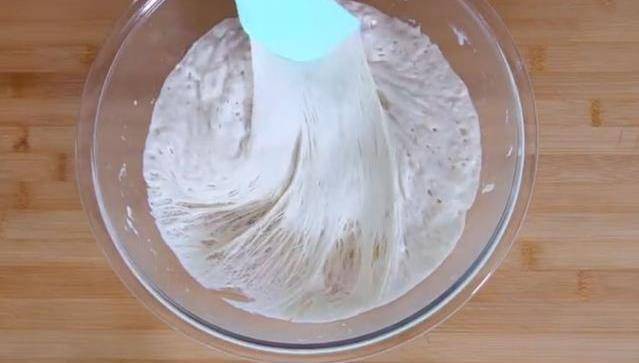 2.準備450克清水,一邊倒一邊攪拌,攪拌成這樣比較粘稠的糊狀,蓋上蓋子發酵至兩倍大。