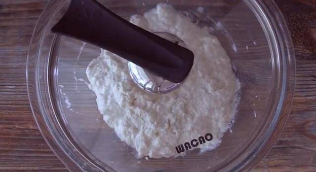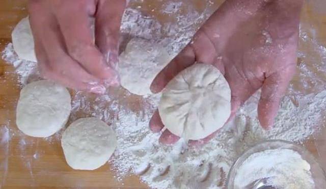 7.面團很粘手,一定要註意多放面,將面團壓扁裡面放上餡,然後像包子一樣收口,收口朝下放在案板上。
