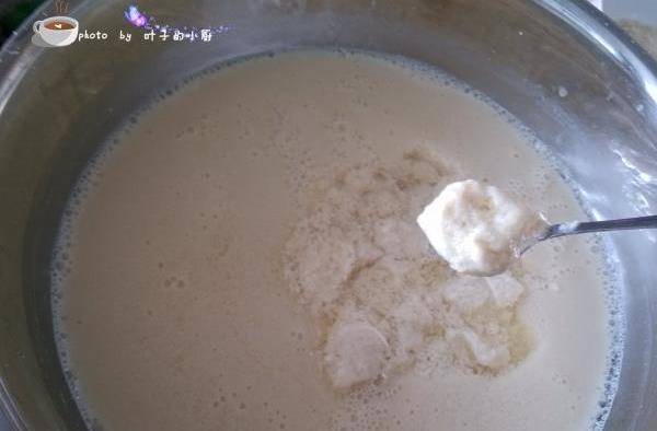 豆汁裡先放入鹽,攪拌均勻,然後邊攪拌變倒入內酯水