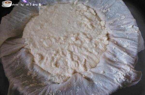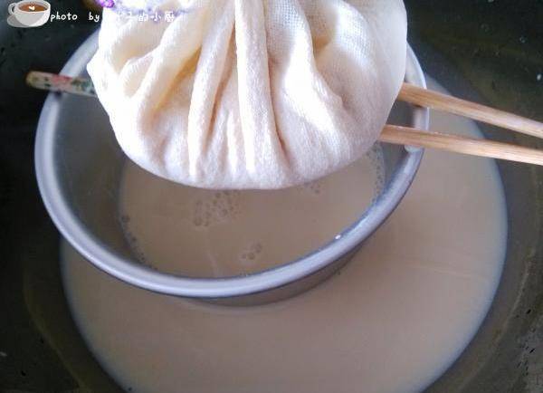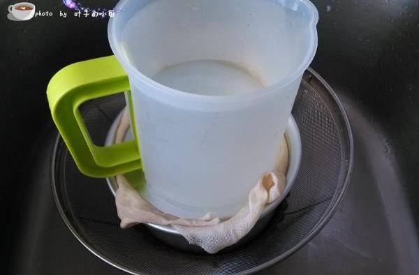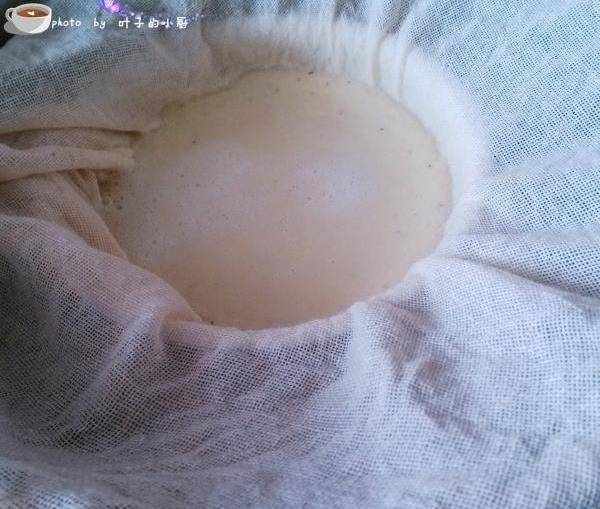 將豆花倒入鋪好紗佈的漏網裡,我沒有專用工具,用瞭一個蛋糕模