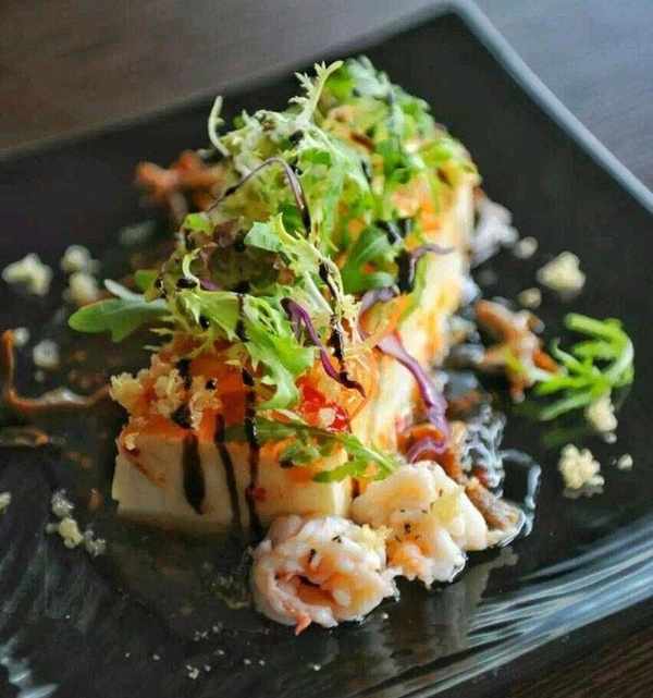 將豆腐放置於盤中,淋上泰式甜辣醬,撒上天婦羅碎、沙拉菜置於豆腐頂端,淋上濃縮黑醋汁即可