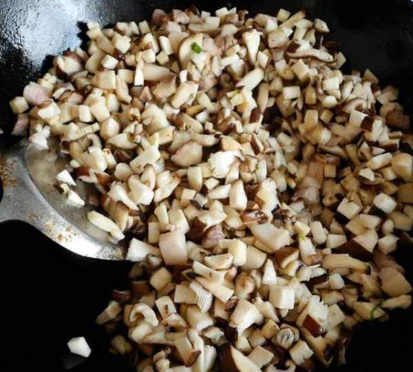 第9步、再放入香菇和杏鮑菇粒翻炒至斷生。