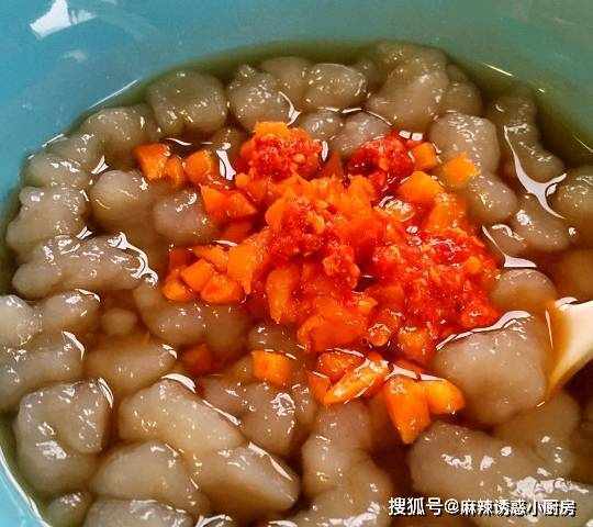 蛙魚是徐州的一種特色小吃。形如蝌蚪狀的這種涼粉類小吃,做法特簡單,整個過程也就10分鐘不到。就是將淀粉用清水調勻後倒入燒開的沸水中,淀粉遇熱會被煮成半透明的糊,趁熱將糊倒在帶漏眼的器具,讓它漏著滴入到備有冷水的盆中,熱的淀粉滴遇冷後就會瞬間凝固,也就成蝌蚪狀的蛙魚瞭。