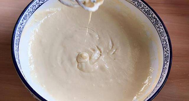 第一步:大碗裡打入兩個雞蛋,用蛋抽攪散,再加入200克室溫水充分攪開;然後加入3克酵母、3克白糖一起攪勻,再少量多次地加入200克面粉,拌成細膩無疙瘩的面糊;最後蓋上蓋子醒發1個小時左右。