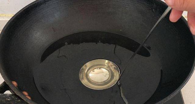 第三步:鍋裡加入足量的油,油溫用筷子試一下有少量的小泡泡即可。把小勺子擦幹水分,放入油鍋中燙2分鐘。