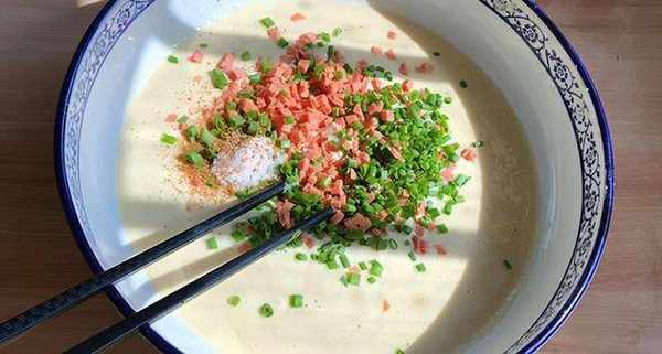 第二步:小蔥切末,火腿腸切成細丁備用;面糊醒發好後用筷子攪拌排氣,然後把切好的蔥花和火腿加進來,再加入適量鹽、十三香調味增香,拌勻後讓面糊二次醒發10分鐘。