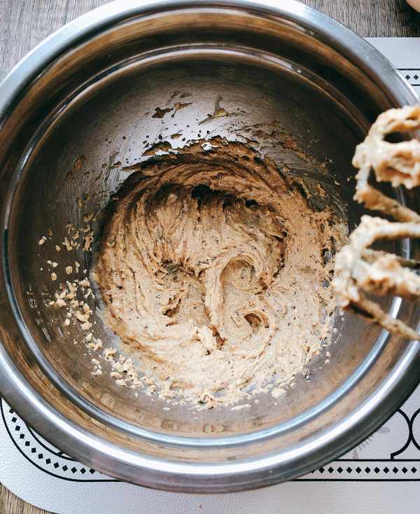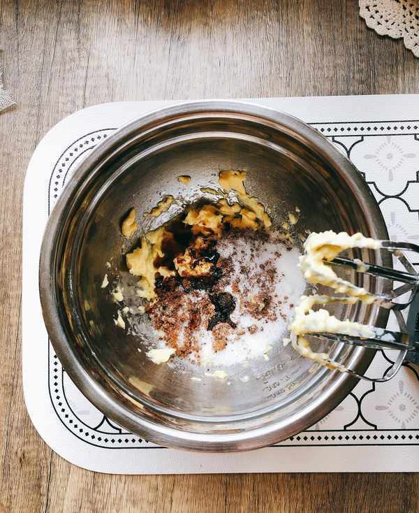 02.黃油和椰子油攪打光滑。加入紅糖、糖和糖漿。攪打至完全混合。中途記得刮碗。