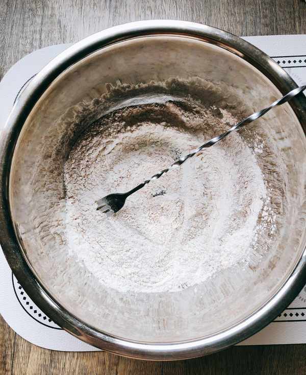 01.幹粉類:中筋面粉、鹽、小蘇打、泡打粉和肉桂粉,混拌均勻。