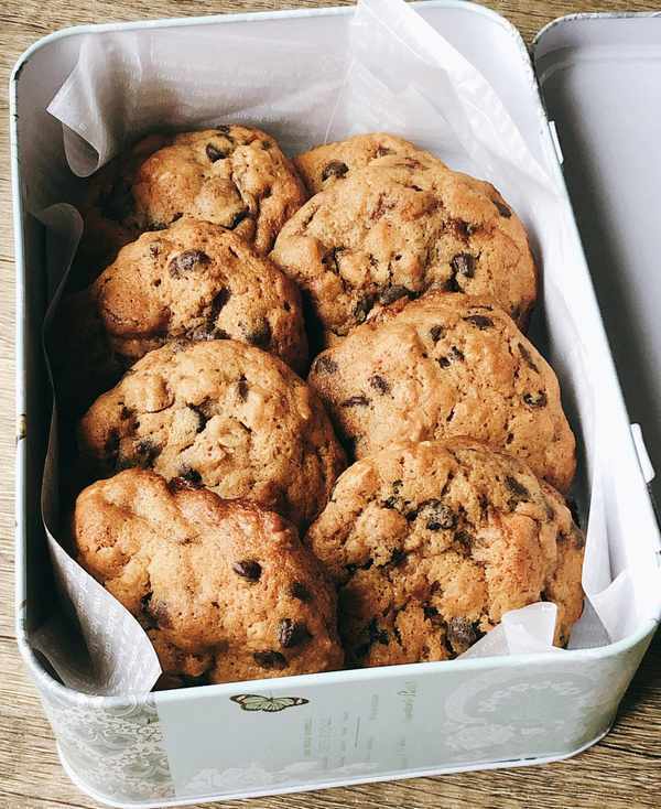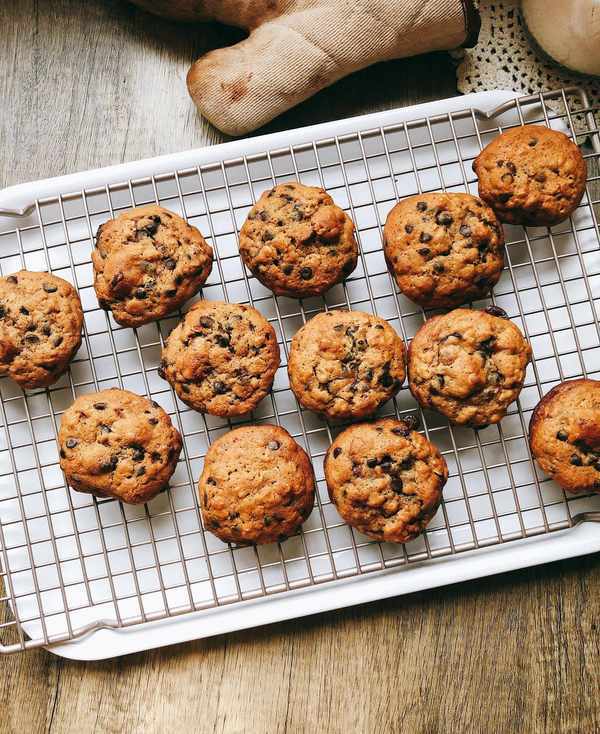 中粉110g、燕麥片6大勺(30g)、海鹽1/4小勺、小蘇打1/4小勺、泡打粉1/4小勺、肉桂粉1/2小勺、軟化的無鹽黃油55g、椰子油1大勺、紅糖2大勺、砂糖5大勺、糖漿或蜂蜜1/2大勺、室溫大雞蛋1個、72%耐烤黑巧克力豆80g、桂圓幹50g