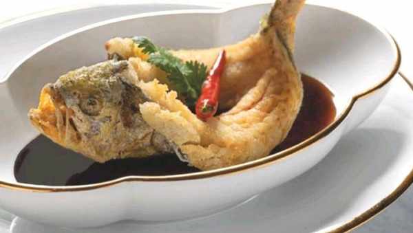 起鍋燒熱油油溫160度,將黃花魚浸炸至金黃色控油備用,蒜肉爆香下入醋汁煮均勻即可。