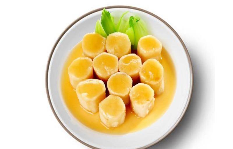 把山藥去皮切成5厘米的段再飛水,加入上湯、礦泉水、薑汁酒上籠蒸10分鐘備用