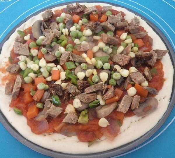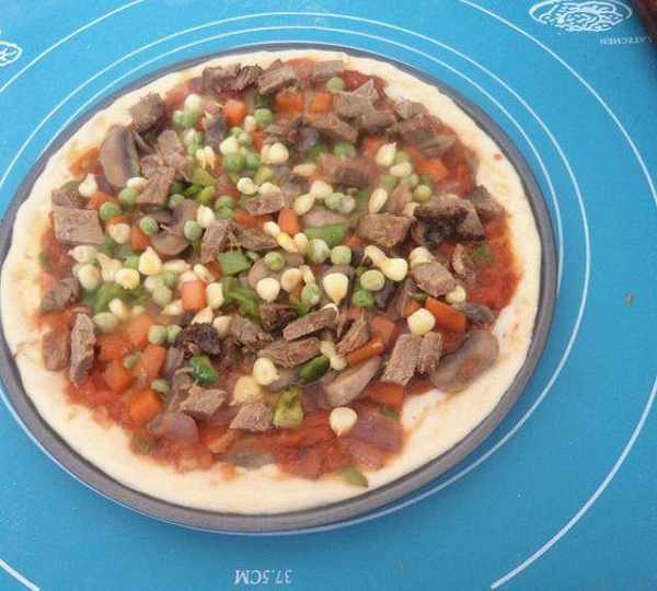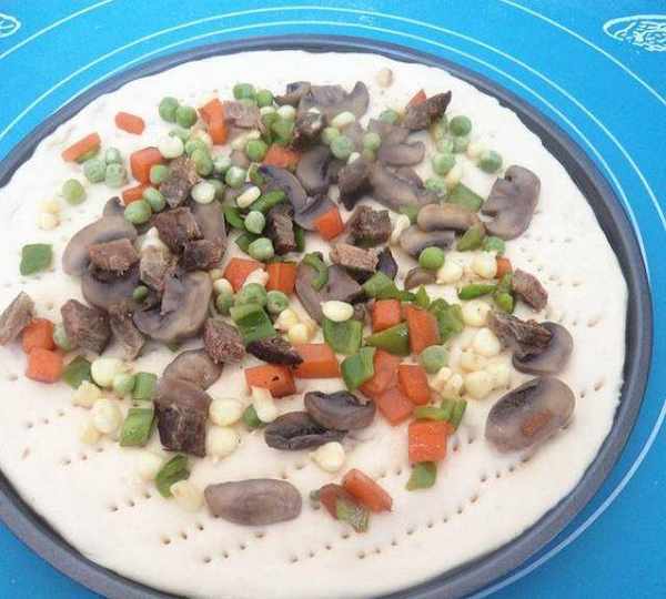 第16步、撒上牛肉、胡蘿、口蘑、青椒、豌豆、玉米粒。