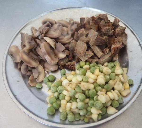 第4步、牛肉、焯過水的口蘑切成丁。豌豆、玉米粒從冰箱取出解凍。