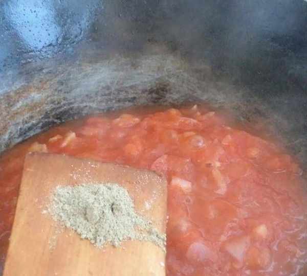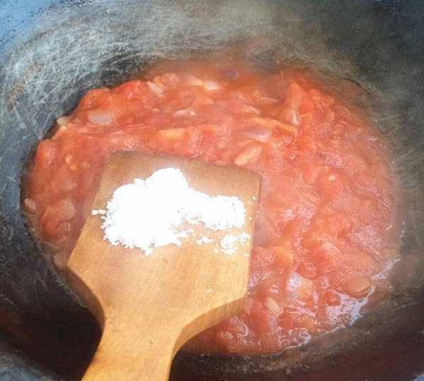 第14步、炒至汁稠,加黑胡椒粉炒,炒均勻,披薩醬就好瞭。