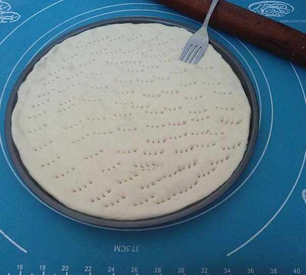 第15步、醒發好的面團搟成圓,放在披薩盤中,用叉子差些小孔。